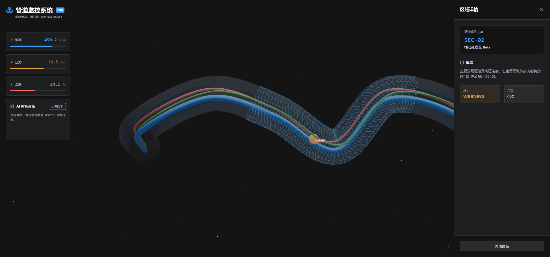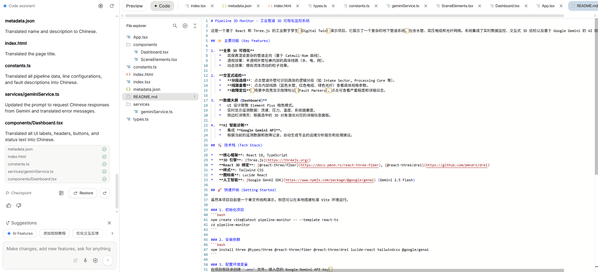 一句话生成一个应用,零报错,对于不会编程的选手来说,体验很不错,从UI到交互完全不像是100秒内完成的产品,同时可以直接源码下载下载,源码基本上都是基于React 18 + TypeScript + Tailwind CSS,网上有人晒出了大量基于Gemini 3.0做的作品,看起来十分的酷炫。整体使用下来超级湿滑,晒一个我让他生成的东西吧工业风3D数字大屏